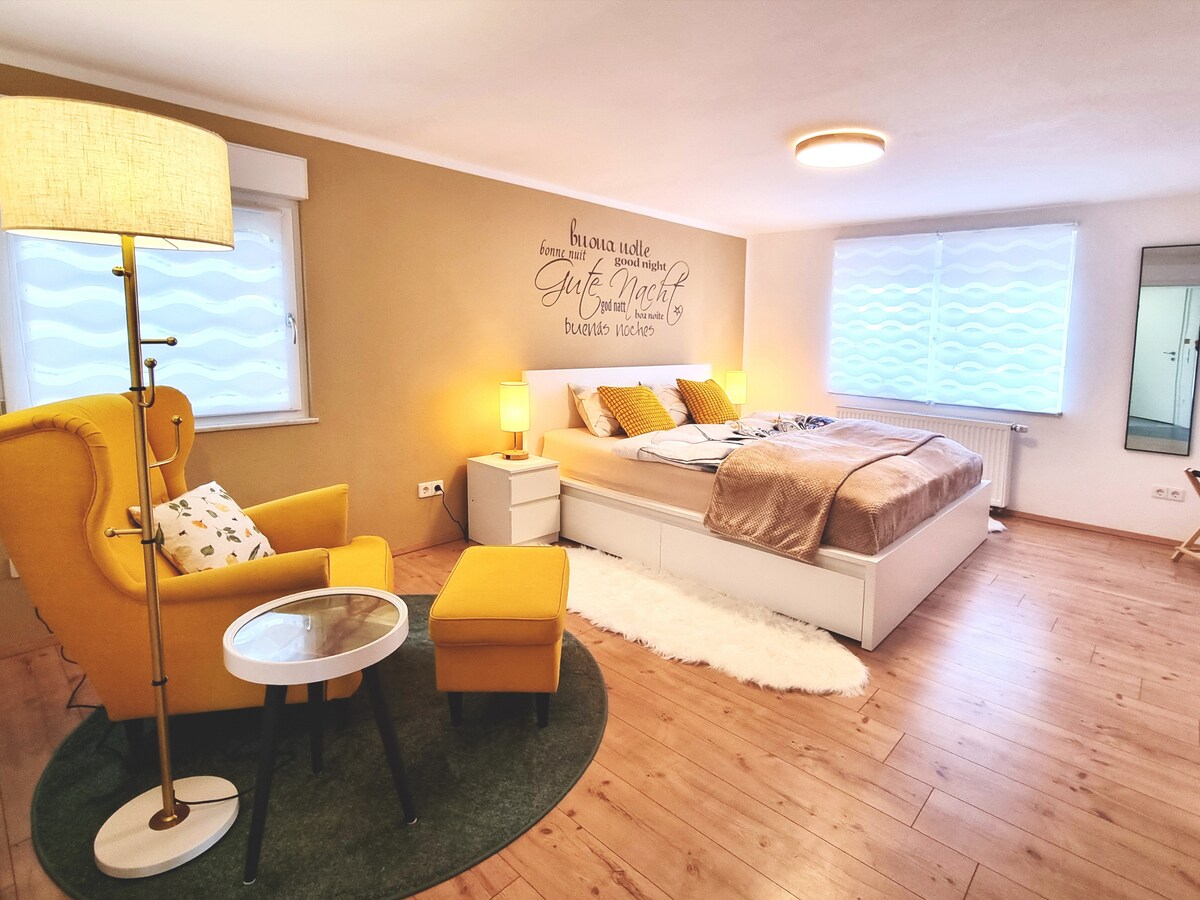 Mein Haus ist im südfranzösischen Stil 2007 erbaut und strahlt Urlaubsflair aus. Die Wohnung befindet sich im Souterrain, hat einen eigenen Eingang und kleinen Terrassenbereich gen Osten. Im großen Raum befinden sich dann Küche, Essplatz und Schlafzimmer in einem, aber angenehm unterteilt. Lesestoff und ein Backgammonspiel zum Zeitvertreib stehen hier zu Verfügung ebenso wie Netflix. Über einen kleinen Flur mit Schrank und Schreibtisch kommt man in ein großzügiges Bad mit ebenerdiger Dusche. Hier finden sich auch Bademantel, Yogamatte und Utensilien die man halt so braucht :-) (Shampoo, Spülung, Duschgel, Nähzeug, Tampons, Einwegrasierer, Taschentücher, Handspiegel, Fön). Das Haus ist von einem gemütlichen Garten mit vielen Sitzgelegenheiten umgeben. Der große Hof im Süden steht auch meinen Gästen zur Verfügung mit einer Loungegruppe, einem Grill und Hängematte. Hier kann man in Ruhe abschalten und relaxen. Sehr gerne stehe ich für Auskünfte, Fragen, Brötchen holen und kleine Wunscherfüllungen bereit. Rettigheim ist von Wald, Wiesen und wunderschönen Weinbergen umgeben. Bäcker, Friseur, Krämerladen und Gasthöfe findet man gleich im Dorf. Nach Malsch und zur Wallfahrtskapelle auf den Letzenberg kann man zu Fuß wandern, oder den Tag auf dem Segelflugplatz, dem Golfplatz oder im Tierpark verbringen. Der schöne Odenwald ist auch nur einen Katzensprung entfernt, oder wie wäre es mit einem romantischen Ausflug nach Speyer? Wer shoppen will, sollte unbedingt nach Mannheim. Rettigheim ist ein kleines Dorf mit idealer Autobahnanbindung zur A5 und A6. Heidelberg, Speyer, Mannheim, Karlsruhe sind in 30min. mit dem Pkw erreichbar. Auch mit der S-Bahn klappt das prima alle halbe Stunde vom Bahnhof Rot/Malsch aus. Die Bushaltestelle befindet sich 3 Gehminuten von uns um die Ecke. Zur SAP St.Leon-Rot fährt man wunderbar auch mit dem Fahrrad über einen direkten, geteerten Fahrweg durch Wiesen und Felder in 10 -15min. Die Umgebung ist sehr ruhig, naturnah und dennoch gut angeschlossen an Städte wie Heidelberg, Speyer, Mannheim, Sinsheim und Karlsruhe.