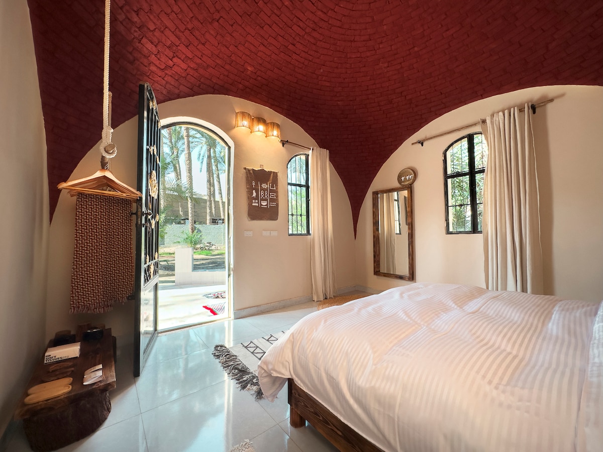 Escape to a one-of-a-kind artistic retreat, where nature and design come together in perfect harmony. This handcrafted studio, just a 5-minute walk from the Pyramids of Giza, offers an immersive experience with natural materials, bespoke handmade furniture, and breathtaking pyramids views right from your private jacuzzi.
