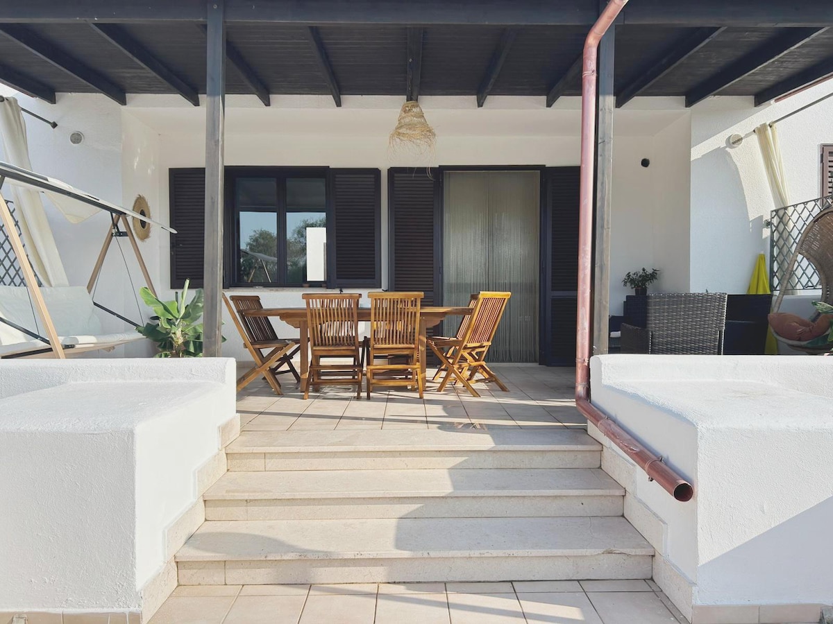 Casa spaziosa con ampio spazio esterno posta su due livelli e di fronte al lido Maldive del Salento. Al piano rialzato un'ampia cucina-soggiorno dispone di un divano letto e il primo bagno. Al piano inferiore, luminoso e arieggiato, ci sono le 3 camere da letto matrimoniali, ciascuna con accesso a cortili interni privati, e il secondo bagno con doccia e lavatrice. All'esterno l'ampio patio con vista mare coperto da gazebo in legno e dotato di tavolo, sedie, lettini, barbecue e doccia esterna.