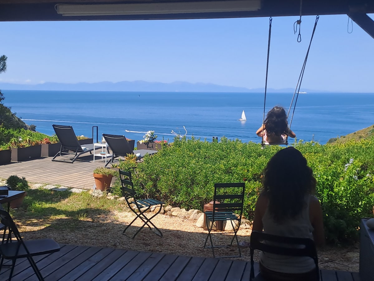 Delizioso appartamento arredato con cura, in stile etnico, provvisto di ogni comfort, in un casolare appena ristrutturato secondo i principi della bioedilizia, immerso nella macchia mediterranea del più bel versante dell'isola d'Elba, con vista mozzafiato sull'arcipelago toscano e sulla Corsica, a 250 m sul livello del mare, dominante la spiaggia di Cavoli. L'appartamento è composto di soggiorno con angolo cottura e divano-letto per due persone, camera matrimoniale e bagno con doccia e ampio spazio esterno attrezzato per pranzare e prendere il sole. Il luogo è raggiungibile con una strada sterrata di 2,5 km dal paesino di San Piero in Campo (fin dove arrivano i mezzi pubblici), distante pochi minuti di macchina dalle spiagge più incantevoli dell'isola (Cavoli, Seccheto, Fetovaia) e dal centro turistico e commerciale di Marina di Campo. E' consigliabile disporre di un mezzo proprio. La casa è immersa nella tipica macchia mediterranea alternata a grandi e suggestive scogliere di granito. Il grande giardino è recintato, contiene un orto e un uliveto. Non vi sono altre abitazioni nei dintorni. Intorno alla località si snodano i più suggestivi sentieri per gli amanti del trekking e della mountain bike. Ideale per chi è in cerca di silenzio, relax, aria pura, e ama la natura e i luoghi un pò speciali. I padroni di casa potranno aiutarvi per ogni evenienza e perplessità. BREATHTAKING VIEW ON THE ARCHIPELAGO Charming apartment,furnished in ethnic style,with every comfort,in an old cottage just renovated according to the bioarchitecture,amidst the Mediterranean bush in the most beautiful part of Elba island with breathtaking views on the Tuscan archipelago and (email hidden) a.s.l.,overlooking famous Cavoli beach. The apartment has a living room with kitchenette and divan bed for two persons,a double bedroom and a bathroom with shower and a large outside patio for eating and sunbathing. You can reach the place through a 2,5 Km dirt road from San Piero in Campo,where pubblic transport ends,and from where ,in few minutes by car you can get to the best beaches of the island (Cavoli,Seccheto,Fetovaia etc.),and to the touristic and service centre of Marina di Campo. It's better to have your own car or motorbike(you can rent it anywhere on the island). The house is surrounded by the typical mediterranean bush scattered with huge granite cliffs. The large garden has an olive grove and a vegetable garden. The place is secluded and there are no other houses in the surroundings. It's an ideal place for trekking and mountain biking and lovers of relax,peace,nature and special places. Your host are ready to help for any need and request.