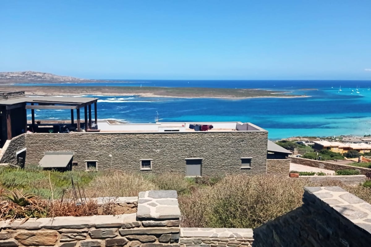 Casa completamente ristrutturata con vista mozzafiato su Pelosa, golfo dell'Asinara e suggestivo paesaggio sardo. Le ampie vetrate conferiscono un'interazione incantevole con il paesaggio circostante. Tutti i confort e le dotazioni necessarie per una vacanza indimenticabile (lavanderia esterna, lavastoviglie, microonde, aria condizionata ovunque, TV Sat, giardino, doccia esterna, etc.). Ampia terrazza che domina il mare, uno studio e due ampie camere da letto con bagni
