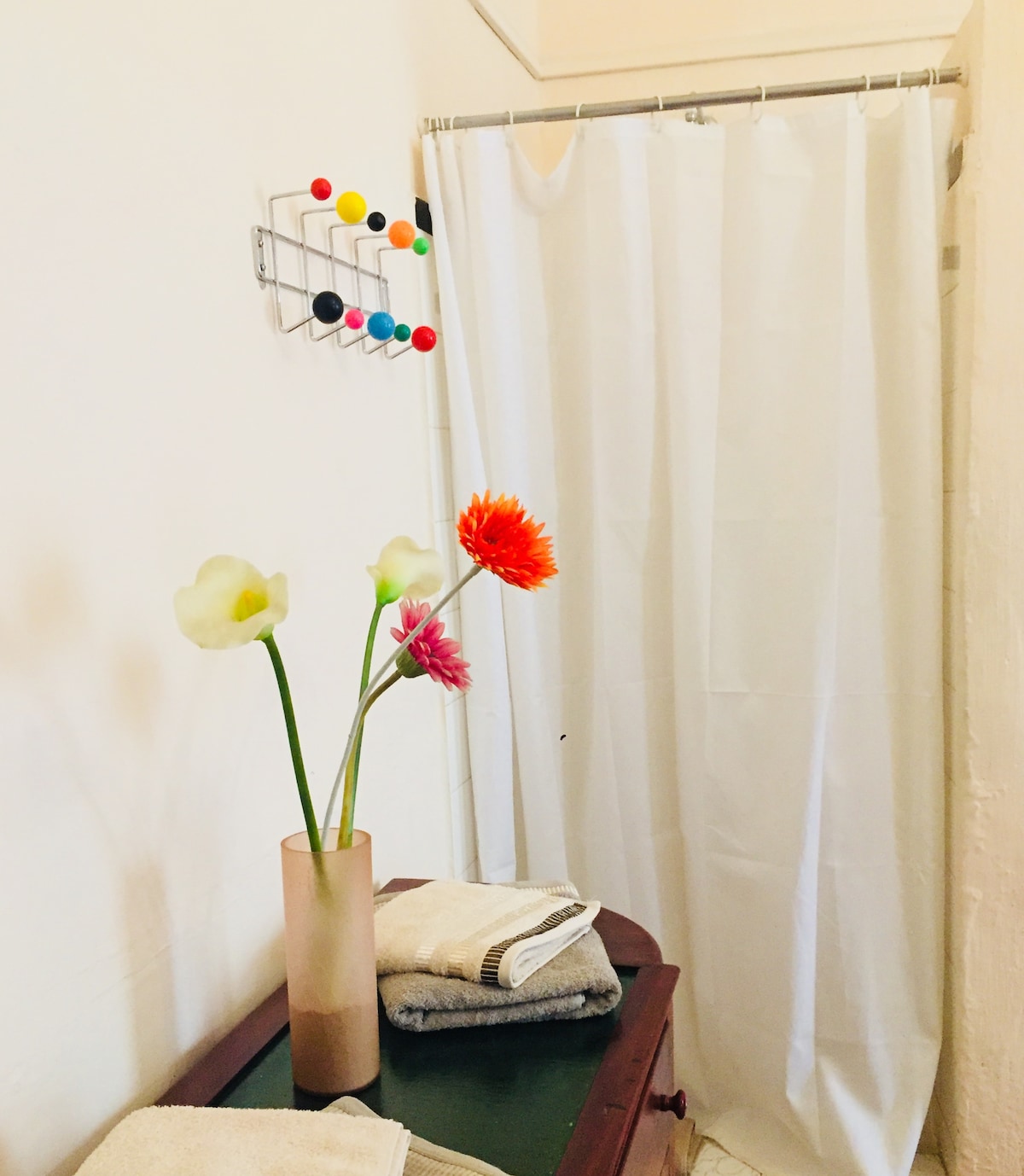 The room is on the groundfloor and ensuite (shower, toilet and wash hand basin). Its queen size bed (180x200) may also be set up in a twin format if requested (90x200 each bed), topped with an orthopedic mattress and memory foam topper for extra comfort.
