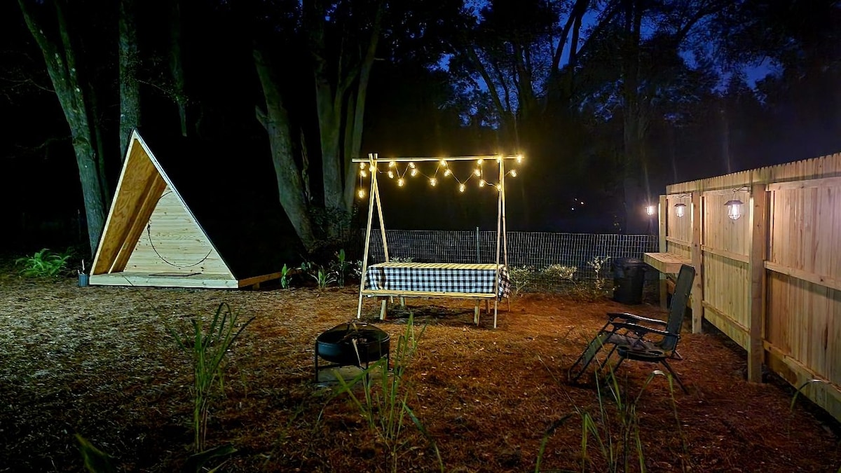 Get away from it all when you stay under the stars. Our A-frame Hobbit House is cozy and dry and sleeps 2 . The Aframe has electricity and AC in the summer months and heater for the cooler months. There is an outdoor bathhouse that is shared with the other people on the property. Outside, there is a picnic table, chairs, gas grill with burner, and firepit. You are welcome to use the firewood found on our property. Please note we have two very friendly golden retrievers and chickens on property.