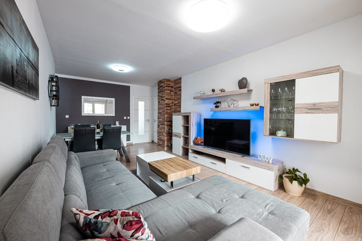 Our new apartment Carmen is located in Split in the area of Žnjan and is only 150 meters from the sea and 3.5 km from the city center. The apartment consists of living room, kitchen, dining room, two bedrooms, bathroom, toilet and balcony with open sea views. The living room and bedrooms are air-conditioned. it is located on the 1st floor of a small residential building equipped with an elevator and parking space in the garage. Nearby are markets, coffee bars and pizzerias.