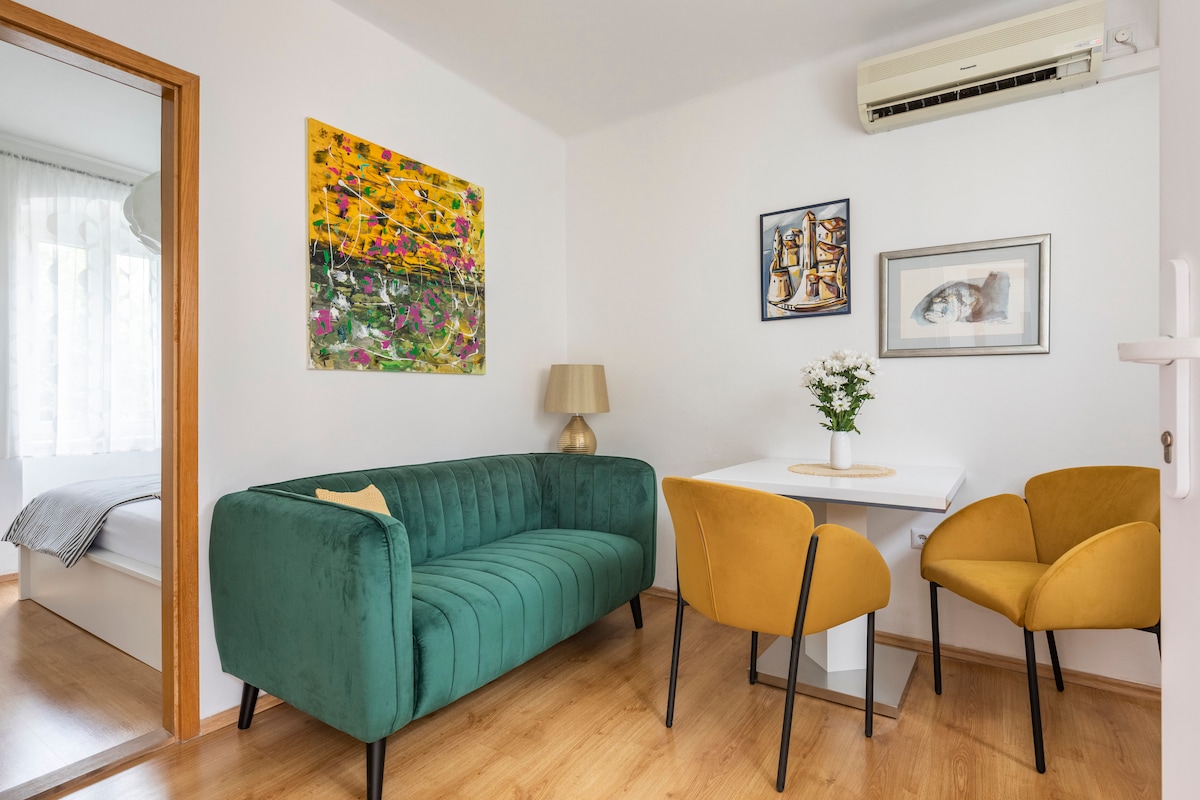 Enjoy breath-taking sea views from Your private balcony in this art-filled Split home. Perfect for 2, this bright apartment offers a dedicated workspace, fast Wi-Fi, and a rare private parking space. Just minutes on foot from Diocletian's Palace, beaches, and the ferry port, it's the ideal base for exploring the city. Experience the best of Split with both tranquillity and central access.
