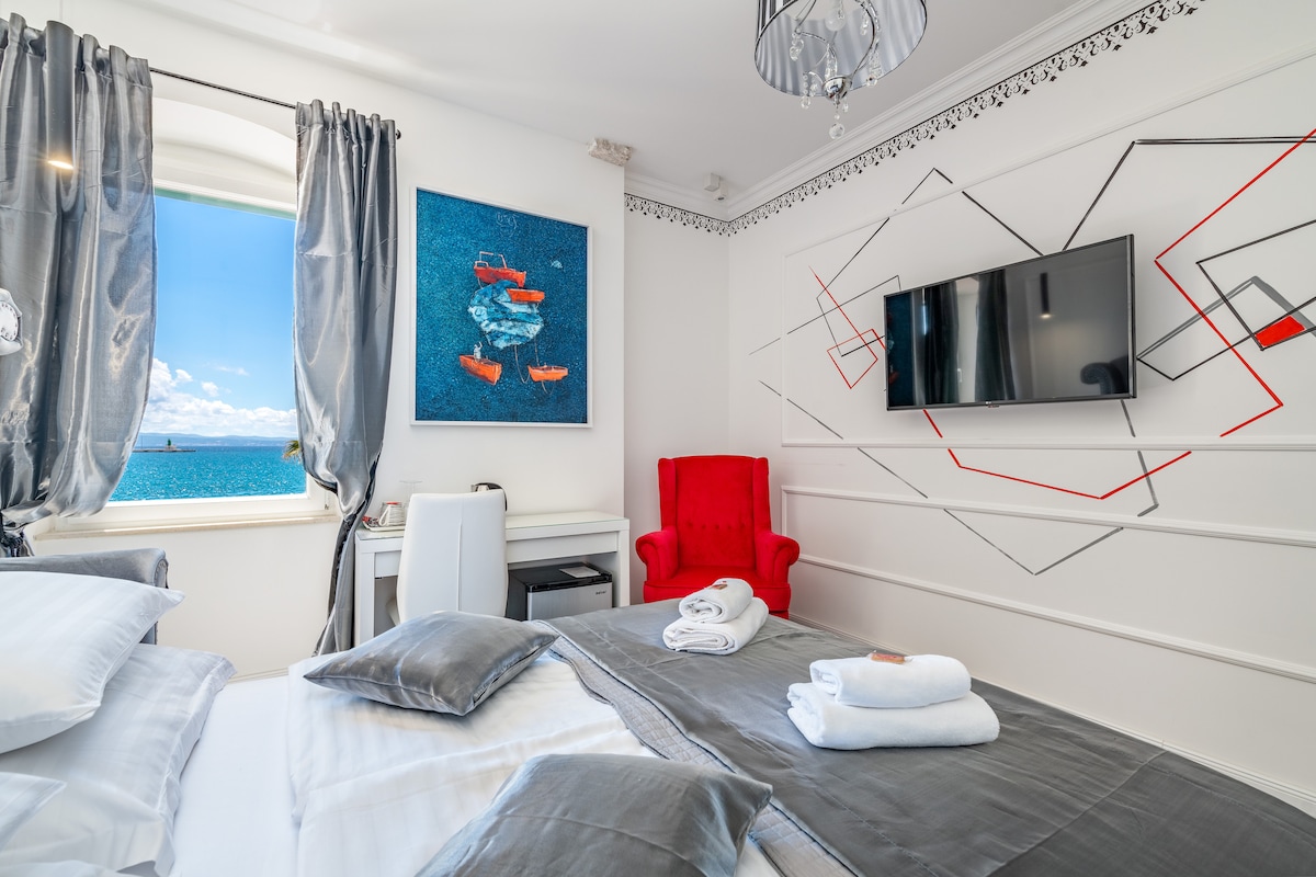 Deluxe Double or Twin room with en suite bathroom, jazucci tub for 2, sound and lightning therapy. Sea view from room or bathroom. 2nd floor, very quiet and prime location. Between the most popular sady beach Bacvice and the main promenade, each way 3min walk. Private parking spot on request for 15,00 Euros/Day.