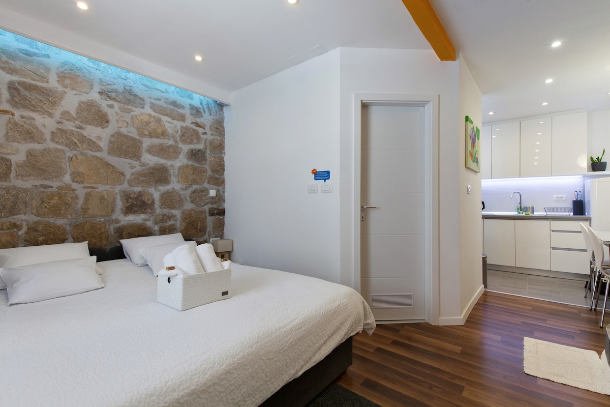 This stylish and modern studio apartment is situated in the heart of the city center, right within the charming pedestrian zone. Nestled inside a beautifully preserved traditional Dalmatian stone house, it offers a unique blend of history and contemporary comfort. Recognized as a cultural heritage site in 2013, the building showcases authentic architectural details, giving guests an opportunity to experience the rich history of the region while enjoying modern amenities in a prime location.