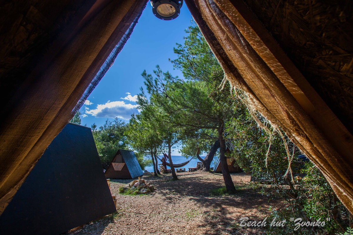 Unique glamping tent tucked under the almond tree and between olive trees with queen size bed overlooking sea with mini bar, private pool and charming private outdoor bathroom. Eco Ranch is located on two acre with main house and two glamping tents for two with there own private pool and bathroom. Tents are separated 100m apart for a full privacy. Guest can share main house that includes kitchen, bathroom, wifi,indoor fireplace, outdoor bbq, eco vegetable garden,in/out lounging and much more.