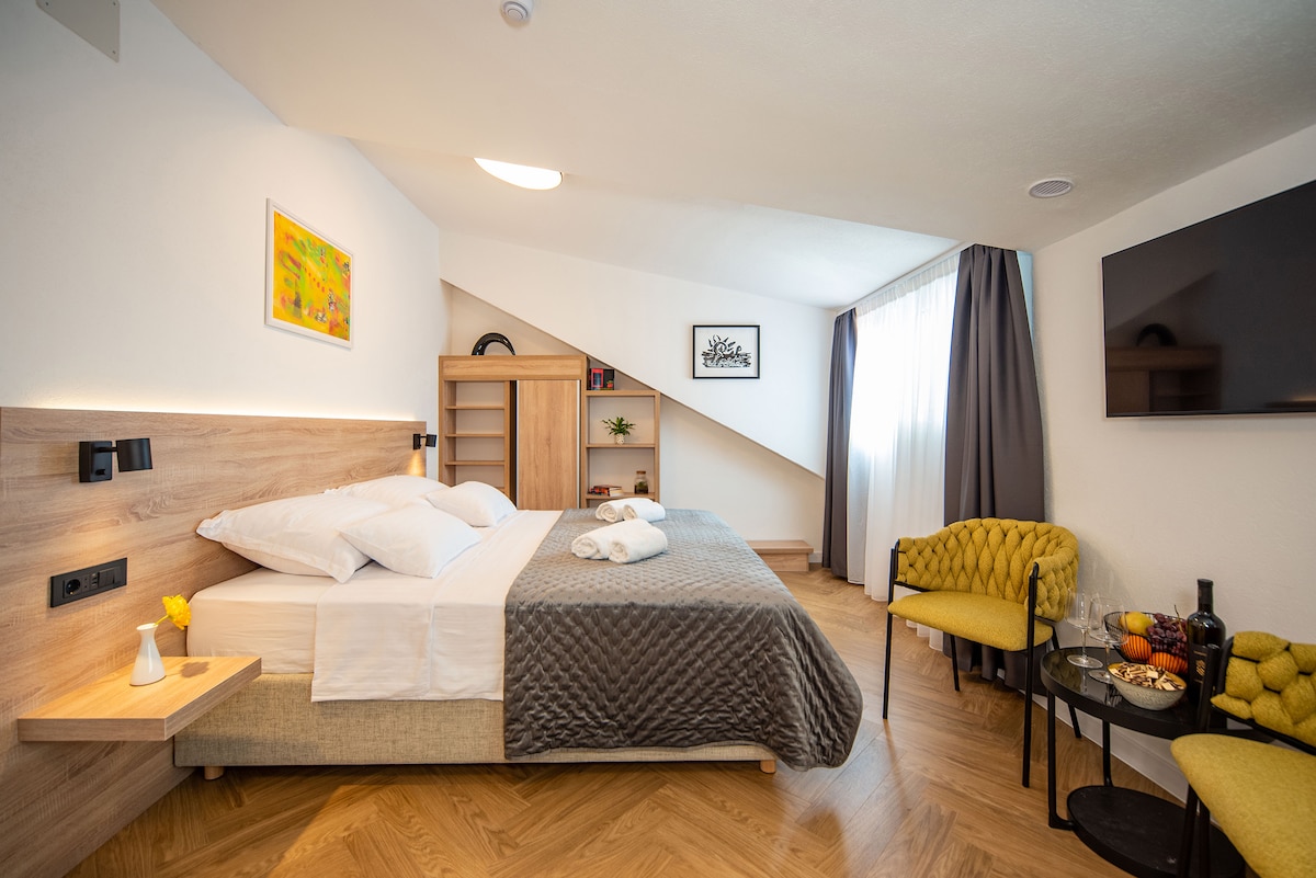Elegant room for 2 people, offering sea views as well as views of the majestic Biokovo Mountains. Amenities: 1 king-size bed, balcony, sea view, mountain view, air conditioning, terrace, private bathroom, flat-screen TV, minibar, free Wi-Fi. Breakfast and dinner are available at the restaurant on site (for an additional charge) Restaurant in operation from 01.05. to 31.10. Pool in operation from 01.05. to 31.10.