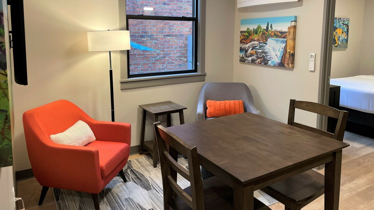 Welcome to J&K on Main! - Thoughtfully renovated luxury travel apartments with high-end finishes. - Full access to your travel apartment, fully stocked with all the amenities you’d find at home. - Luxury Memory Foam King bed + Sleeping for one on the couch. - Shared pool table room for quality time with friends and family. - Paid secured parking garage nearby ($30+/day which is standard for downtown.)