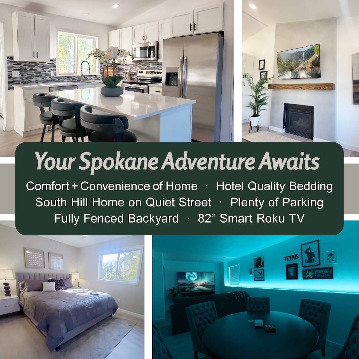 ⛰️Panoramic mountain view and upscale amenities 🍿Theater and Arcades 🌅Large new hot tub 🐶Pet friendly! We have a fenced large grassy backyard ⚡️Tesla Charger 🍗Patio dining with gas grill 🧸Baby pack n play / high chair 💫 Perfect for families with kids, retreats, sports, wedding, vacation, staycation 🏡Newly built 3,849 ft² home near downtown and Gonzaga 🧺Laundry Room w/ sink, washer and dryer 🧹 Professionally cleaned ★Book Today! ★