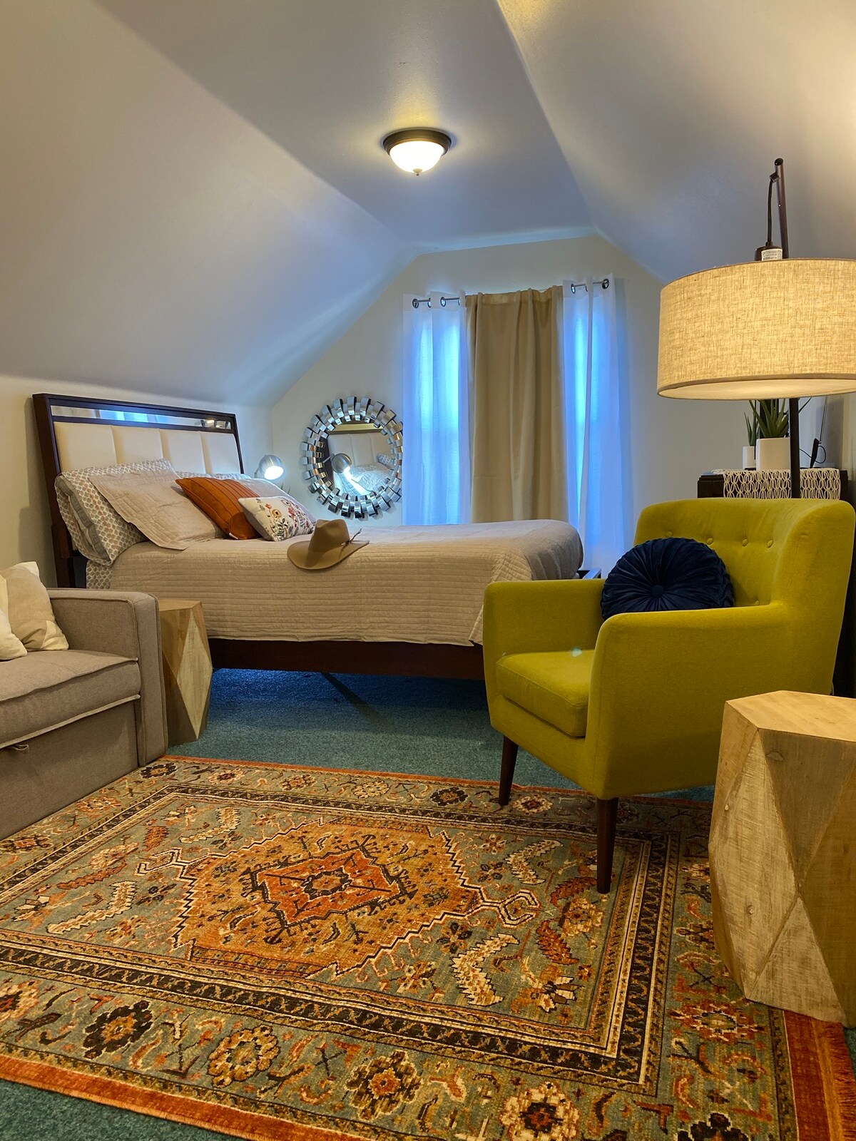 A second story “Guest Suite” with private entrance and entire space to yourselves. One bedroom with queen bed, complete bathroom remodel, and kitchenette with a lit up Parisian style balcony over looking courtyard to which guests are welcome. Cozy and secluded, with a bit of luxury awaits you, all within walking distance to downtown entertainment. Enjoy the ambiance of a fireplace and candles, or the balcony while under the night skies or that morning coffee. Pubs and eateries 1 block away.