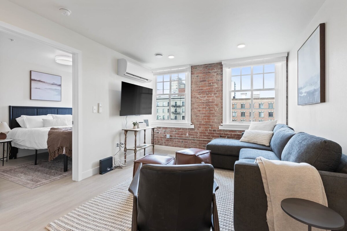 Welcome to J&K on Main! - Thoughtfully renovated luxury travel apartments with high-end finishes. - Full access to your travel apartment, fully stocked with all the amenities you’d find at home. - Luxury Memory Foam queen bed + Sleeping for one on the couch. - Shared pool table room for quality time with friends and family. - Paid secured parking garage nearby ($30+/day which is standard for downtown.)