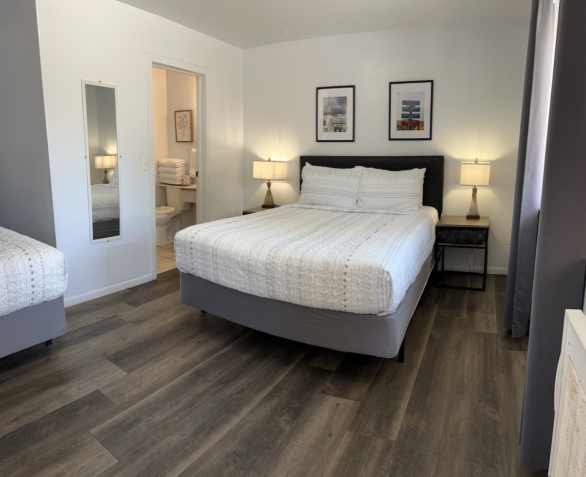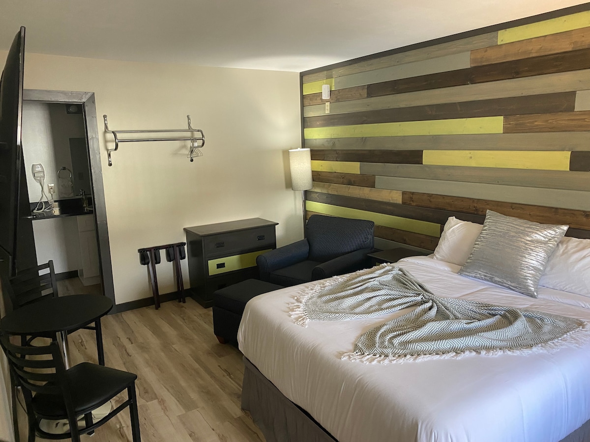 Freshly remodeled (2022) mustang themed room at Lake Village Lodge. Convenient location, near downtown festivities and close to the freeway entrance for quick access to all the mountain, skiing, lake, river, and hiking CDA and the surrounding areas have to offer! This room has a queen bed and futon, So this can comfortably sleep 4. Great home base for all your Coeur d'Alene adventures. If you need more space, check out our suites and room 6 & 7 at Lake Village Lodge.
