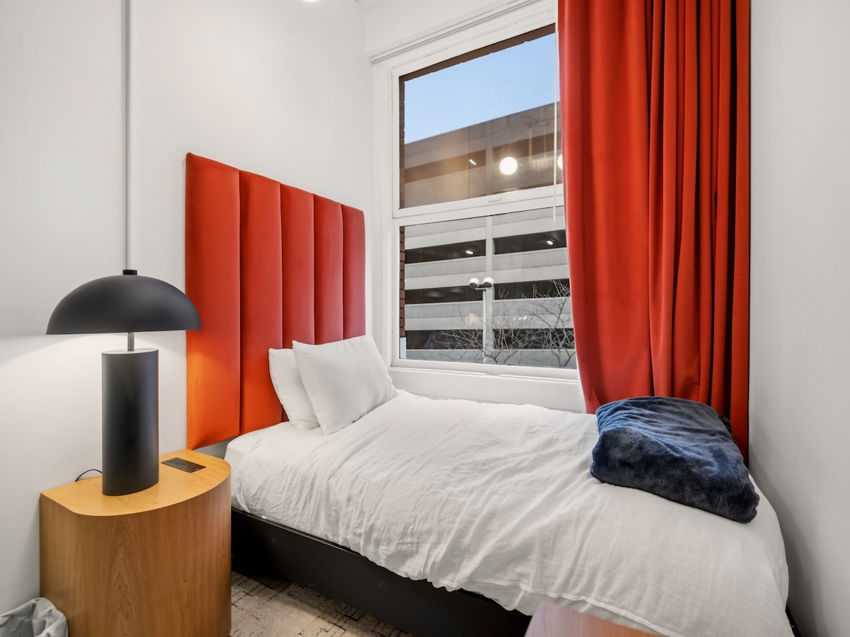 Welcome to the Symons Block Hotel, a boutique stay in the heart of downtown Spokane. Rest in a cozy, European-style room featuring soft linens, plush Turkish cotton robes, and murals by local artist Moneta Lyons. IMPORTANT: The bathroom is not attached to the bedroom. It is located across the hall and is assigned to this room, but it is not exclusively reserved and may be accessed by others if necessary. The bathroom itself is secured with a locked door. Enjoy guest discounts at nearby favorit