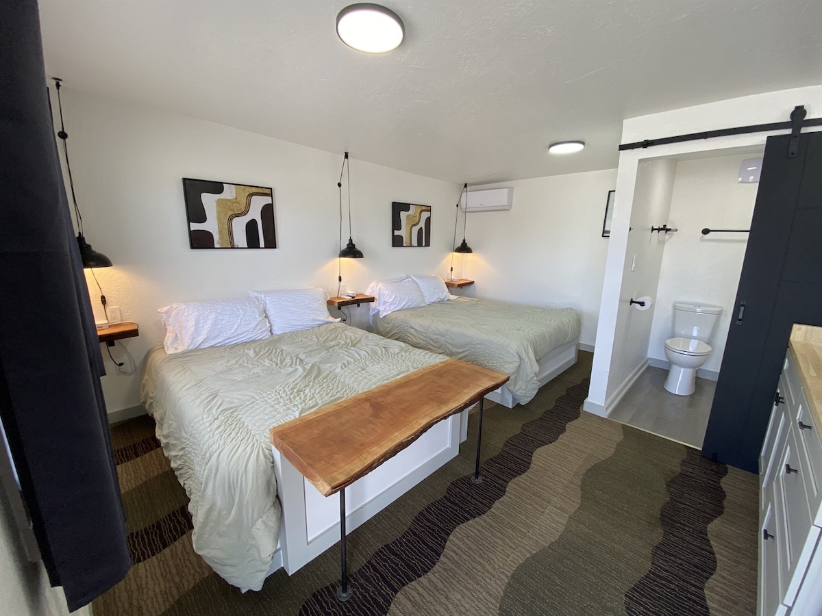 Freshly remodeled (2022) mustang themed room at Lake Village Lodge. Convenient location, near downtown festivities and close to the freeway entrance for quick access to all the mountain, skiing, lake, river, and hiking CDA and the surrounding areas have to offer! This room has a queen bed and futon, So this can comfortably sleep 4. Great home base for all your Coeur d'Alene adventures. If you need more space, check out our suites and room 6 & 7 at Lake Village Lodge.