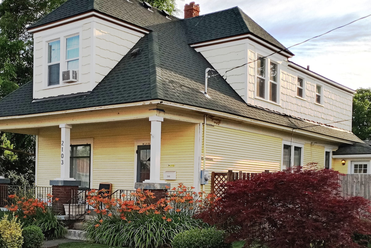 In the heart of Spokane's historic Manito & Cannon Hill Parks. Air conditioned with a private entrance in a 1924 cottage rancher. Safe location on a tree-lined street. 3 minutes to hospitals and interstate 90. Airport 10 min. Ice cream, bagels, coffee 1 block away. Walk to the best parks in Spokane (Manito Park, Comstock, and Cannon Hill.) Grab your mountain bikes or hike "The Bluff" - Spokane's best single-track, with views of Latah Valley 1000 ft below. New paint and Roku TV. Local art.