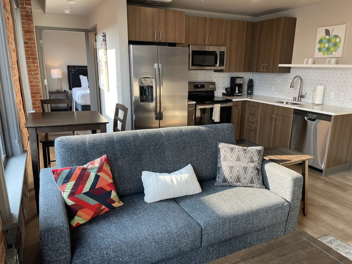 Welcome to J&K on Main! - Thoughtfully renovated luxury apartments with high-end finishes. - Decor and features worthy of any design-admirer’s dream. - Full access to a fully stocked kitchen and in-unit laundry. - Luxury Memory Foam Queen bed for a comfortable stay. - Shared pool table room for socializing. - Fast Business class Wi-Fi and Smart TV - Paid secured parking garage nearby. - Complimentary offerings include free coffee and tea.