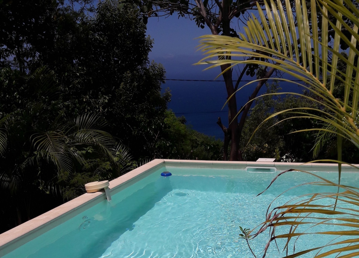 Notre bungalow de charme, vue mer, surplombant Saint-Leu (à moins de 10 minutes du centre et 250m d'altitude), est situé dans un environnement calme et verdoyant. Idéal pour un couple, il se trouve en contrebas de notre maison. Nous n’acceptons pas les enfants pour des raisons de sécurité. La piscine privée, à côté du bungalow, sera idéale pour vous délasser en fin de journée. Mise à disposition d'un frigidaire, cafetière Senseo, bouilloire et four micro-onde. Wifi à l'extérieur, côté piscine.