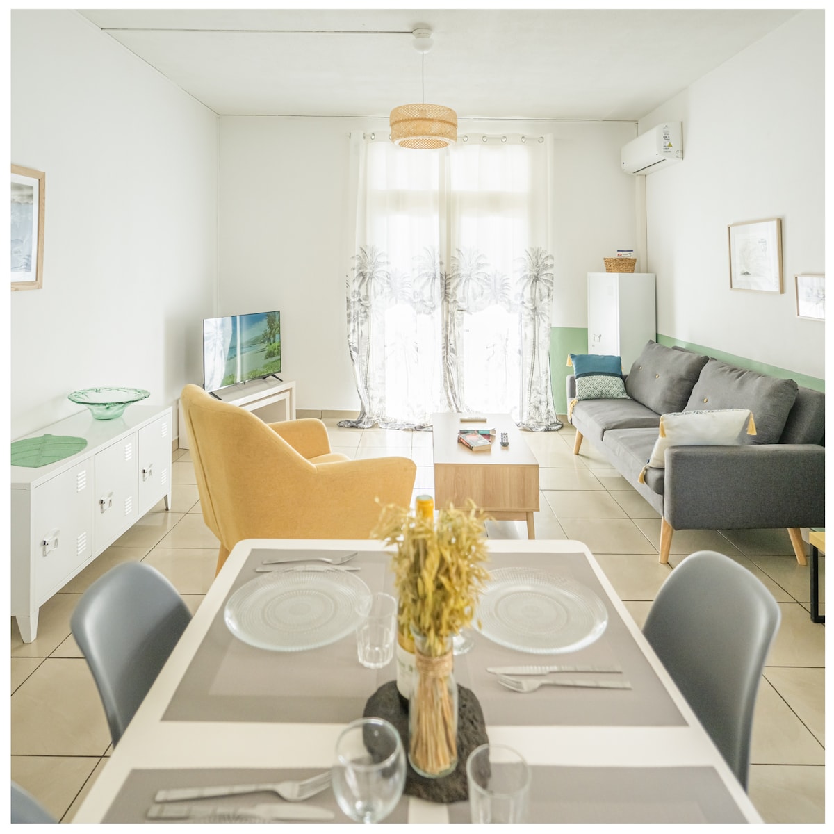 Grand studio tout équipé à quelques minutes à pied du centre-ville et du lagon.L'espace à vivre se compose d'un coin salon/cuisine de 35m2 et d'un espace chambre de 15m2 en mezzanine. La salle de bain est équipée d'une douche italienne. Une terrasse couverte pour prendre vos repas et vous détendre. L'appartement est calme et lumineux dans une ambiance cocooning.