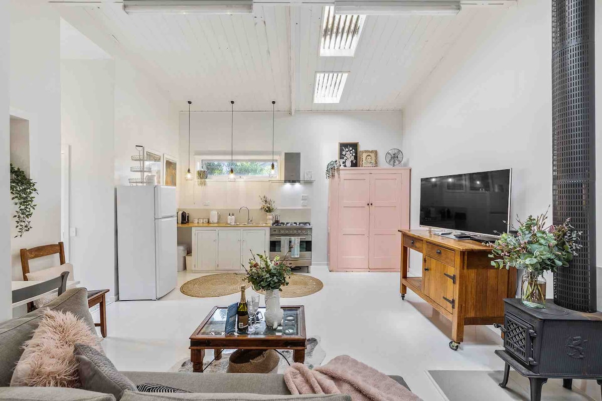 Peaceful loft‑style retreat in the heart of Albert Park. Large open‑plan space with polished floors, vintage charm and modern comforts. Relax in the king‑sized brass bed or unwind on leather sofas. Enjoy Wi‑Fi, TV including Netflix, air‑con, and a compact kitchenette. Private guests-only entrance. Unrestricted on-street parking using host's permit Parks, beach, and local dining all within a short stroll and a tram stop to Melbourne’s CBD only 70m away.