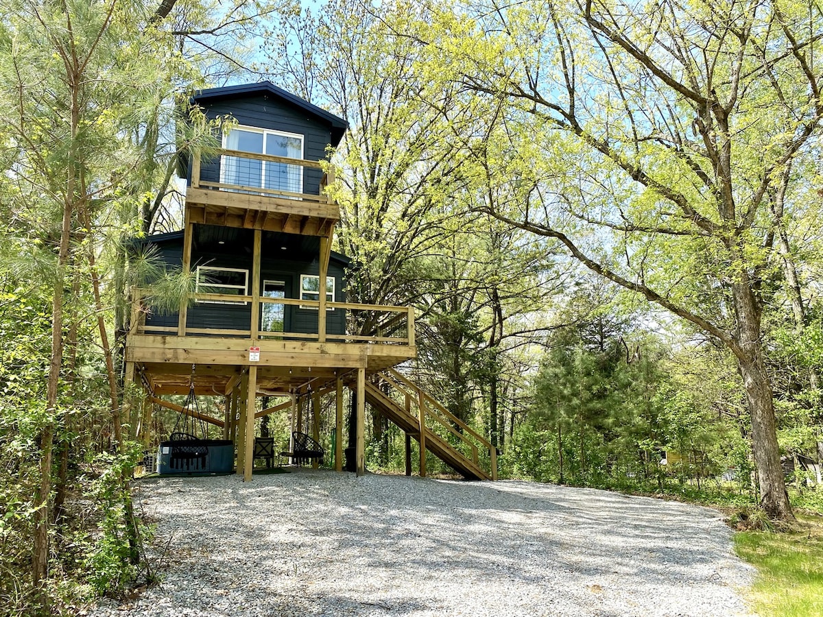 This newly built secluded Treehouse is fully furnished with everything you'll need to make for a relaxing & comfortable stay! This home provides a queen bed upstairs and set of queen size bunks downstairs on the main level. Outdoor seating & hot tub available. Within walking distance to The Eleven Point River. There is a charcoal grill available (charcoal not provided). *Pets are welcome with $50 pet fee *Firewood $10/bundle *Hot tubs are open year round* *Outfitters available nearby*