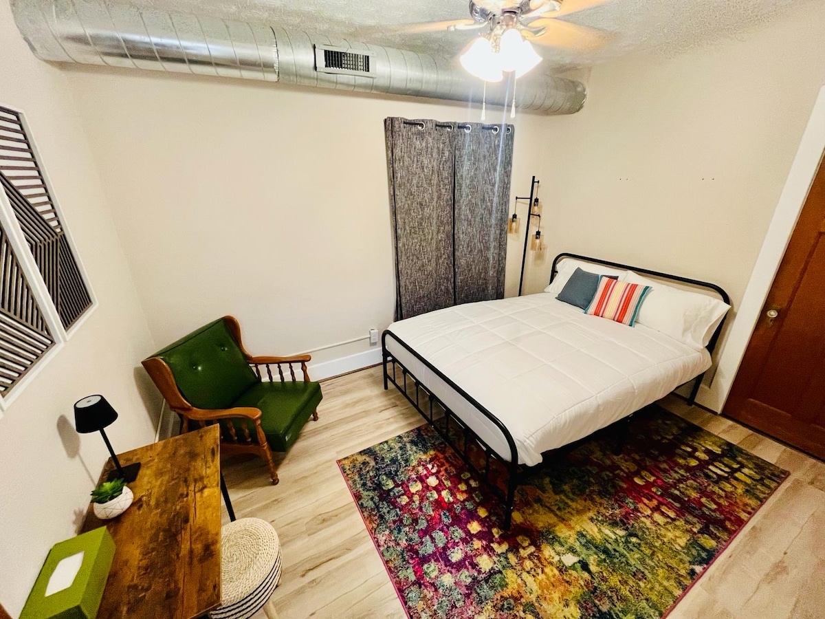 This apartment is a twin to our Pilot Lounge airbnb located across the hall. Two adults can sleep in a dedicated bedroom on a queen bed while your child sleeps on an air mattress (the 2nd bed) in the living room. The kitchen is equipped for basic cooking with a fridge, Keurig, oven, microwave and toaster. There's a 42" TV paired with an apple TV loaded with multiple apps. Alexa provides info and light control. Two window a/c keep the place cool. Parking is available in the adjacent public lot