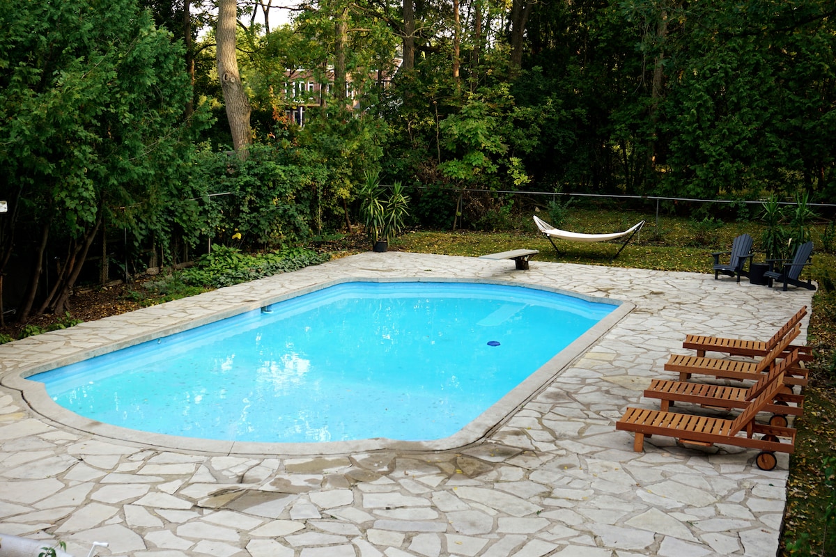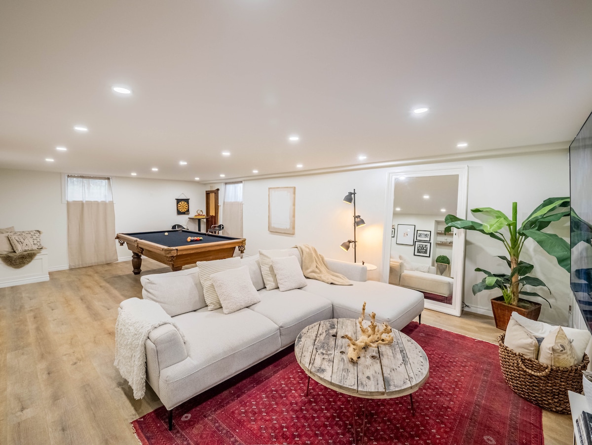 Welcome to our retreat in west London! This stylish Two-Level Basement Split is a guest suite ideal for friends and families. Our 1+Den has 2 comfy Queen Beds, 1.5 bathrooms, a large kitchenette with every appliance you need, and a foosball table for some competitive fun. Outside, there's a hot tub, firepit (BYO wood), BBQ, and outdoor eating area. We live upstairs and are available to assist with the indoor or outdoor amenities at any time!