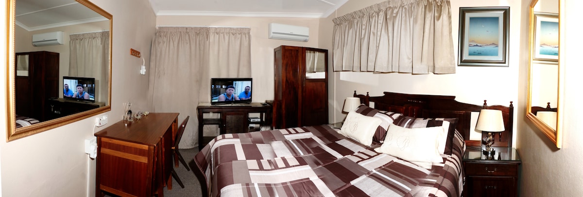 Chalet A is a luxury self-catering unit with an en-suite bathroom with a shower. This bedroom is fitted with a Health-o-Pedic double bed and is allergy-friendly. It is air-conditioned, has DSTV, WIFI, a fully equipped kitchen with cutlery and everything you would need for a braai. Safe off-road parking available, under roof or open area for bigger vehicles or caravans. We are situated in a quiet, peaceful and safe neighbourhood. Chalet A is one of 3 units.