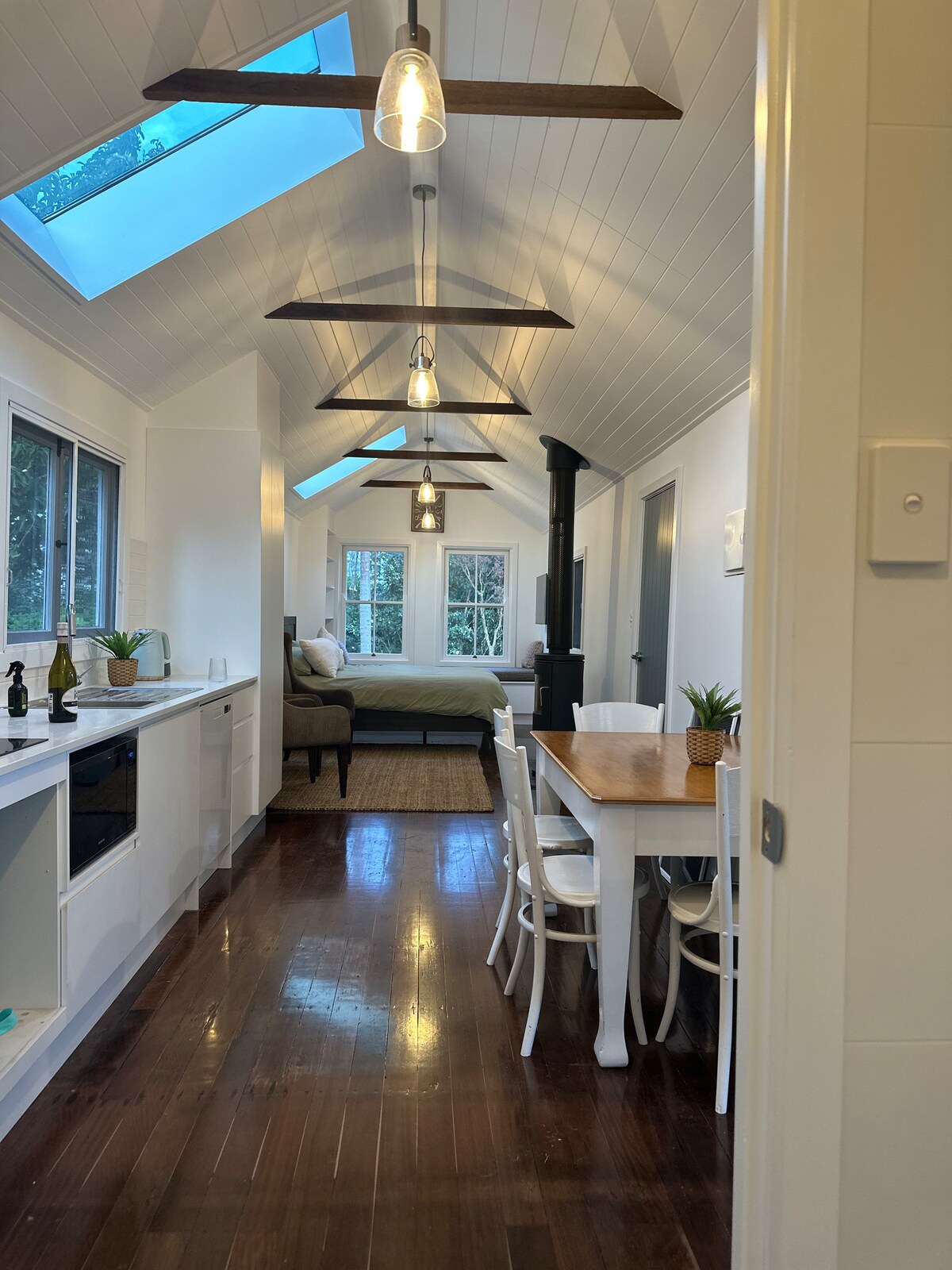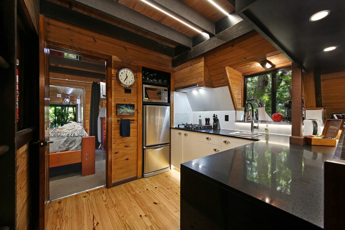 Take my hand and let me guide you to the Water through the Woods… Water & Woods is a self-catered cabin of cosiness, nestled under a canopy of trees, and just steps away from the Purling Brook Falls hiking trails. Here is your opportunity to relax… or be active – surrounded by a very special part of the Gondwana rainforest, less than 50 minutes from the hustle and bustle of those bright lights of the Gold Coast. Yes, that’s what you’re seeing from the breakfast bar.
