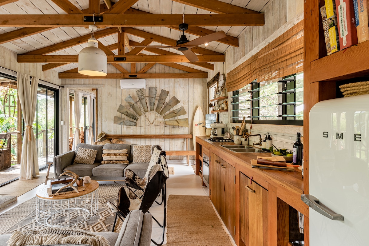Cross the bridge and enter a magical paradise. Set amongst trees, perched in a tropical oasis is this romantic and secluded cabin overlooking the creek. Beautifully decorated interior with a Balinese feel, Complete with fully equipped kitchen, outdoor breakfast bar, wifi, Netflix, cozy wood fire for winter and cooling air conditioning for summer. Escape to this magical paradise.