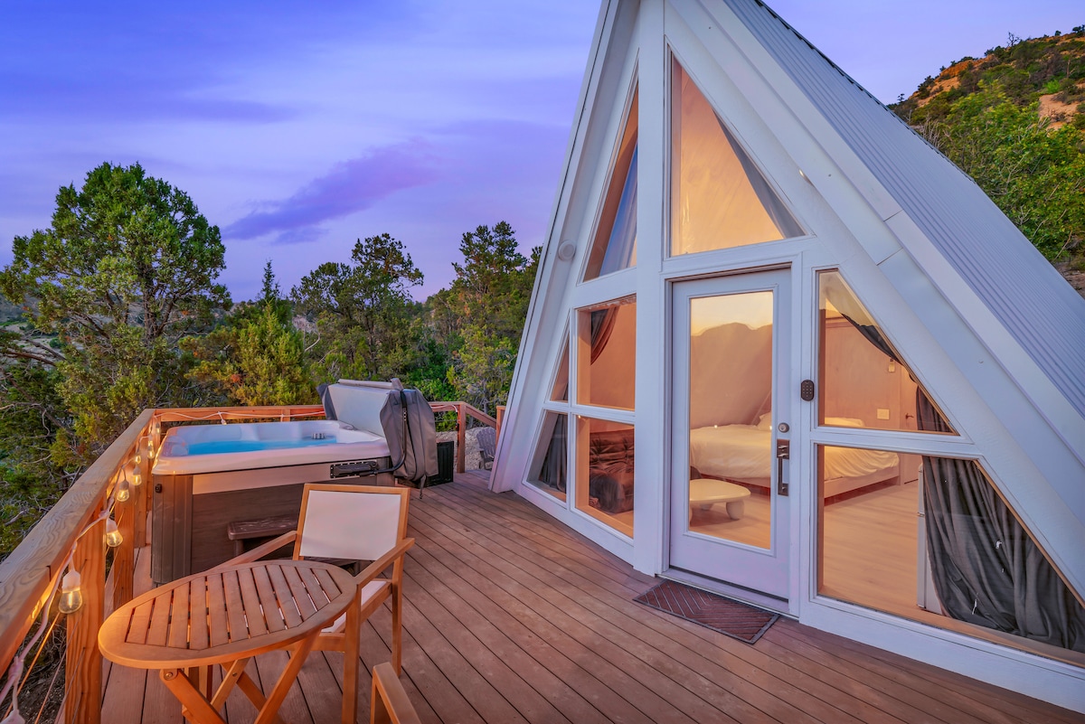 The smartest way to see Zion? From just far enough away that no one else is interrupting your morning porch views 😉 Welcome to your open-sky A-Frame, located 45 minutes from the Main Entrance of Zion NP & within 2 hours of Bryce Canyon, the Grand Canyon, and Page, AZ. All the Southern Utah views, none of the crowd noise. Enjoy your private deck with dining & grilling, hot tub & fire pit. Surrounded by open BLM land with direct access to hike into the canyons from the site! Pet-friendly