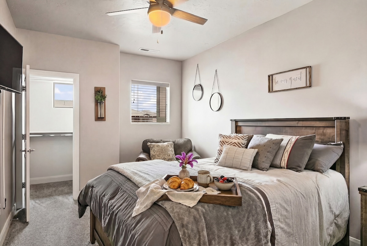 Stunning sunrises and nearly endless outdoor opportunities await you at Zion Village! This luxury getaway is located within a resort setting, offering guests a generous pool area, including a year round hot tub, with a lazy river, clubhouse, fitness center, and many other amenities. In the townhome, you’ll be treated to a fresh, clean modern space, a fully-equipped kitchen, and Smart TVs w/Hulu Live, Disney +, and Netflix. 8 mins to Sand Hollow, 30 mins to Zion Nat’l Park.