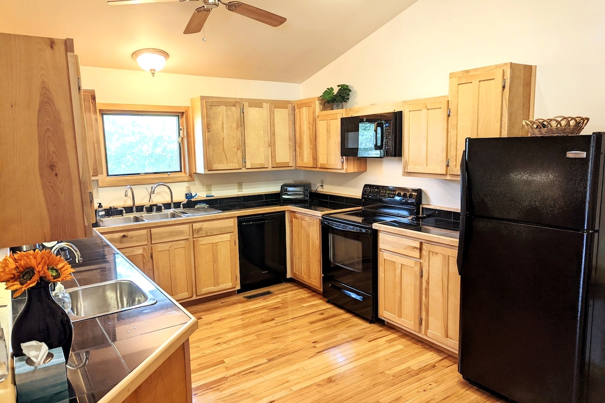Amenities! You don't need to pay more to get the BEST! My guests are amazed at all the Farmhouse has to offer. The home is on a 3rd generation family farm & has 4 huge bedrooms for your upmost privacy. It is definitely in the country yet only minutes from town. Surrounded by pastures, your only neighbors are the grazing cows. It has 2 wonderful porches, firepit area, renovated garage to hang out in, 320 acres to roam on & 2 fishing ponds. Smoking is allowed outside/2 pet max