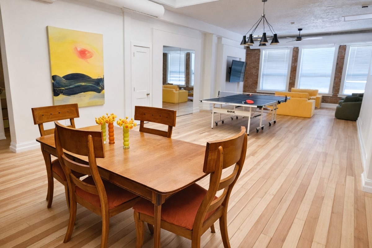 Escape to The Disco Loft, a retro-inspired downtown Springfield retreat for up to 6 guests! This bold, colorful loft features an open-concept living area with a ping pong table, exposed brick, and funky decor. With 3 private bedrooms and an efficiency kitchen, it's the perfect fun home base for exploring the city's best bars and restaurants, all just steps away. Experience a unique stay full of personality and vintage charm.