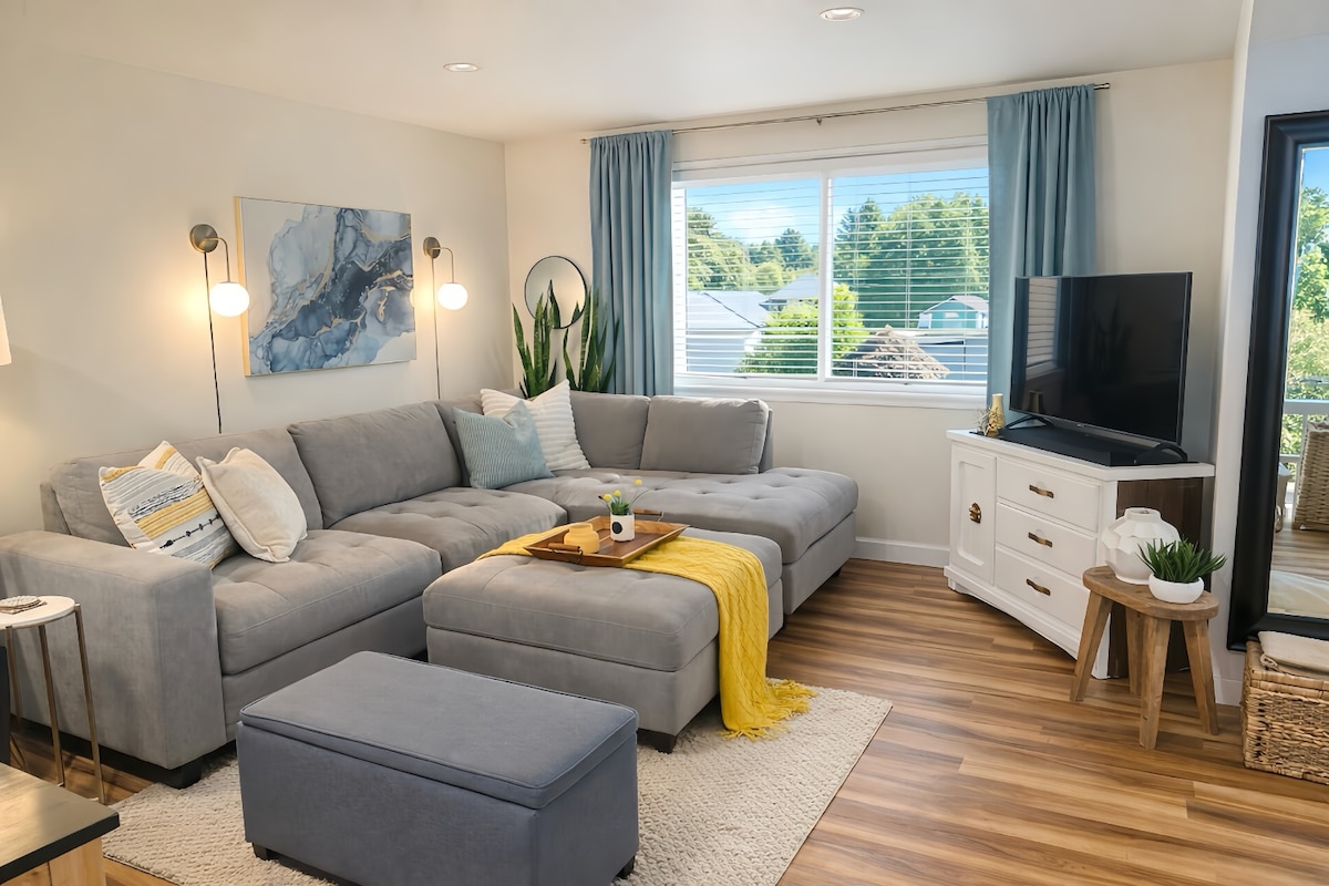 This bright 770 sq ft suite consists of the entire upstairs of my home with two spacious bedrooms with queen beds, a large family room with a queen sofa bed, and bathroom with double sinks and tub/shower. There is no kitchen, but includes an apartment size fridge, microwave, coffee maker, instant pot, and convection oven/air fryer. I provide breakfast (yogurt, fruit, granola, cereal, coffee, tea, cream). Guests enter through the shared front door of the house, and head upstairs to the suite.