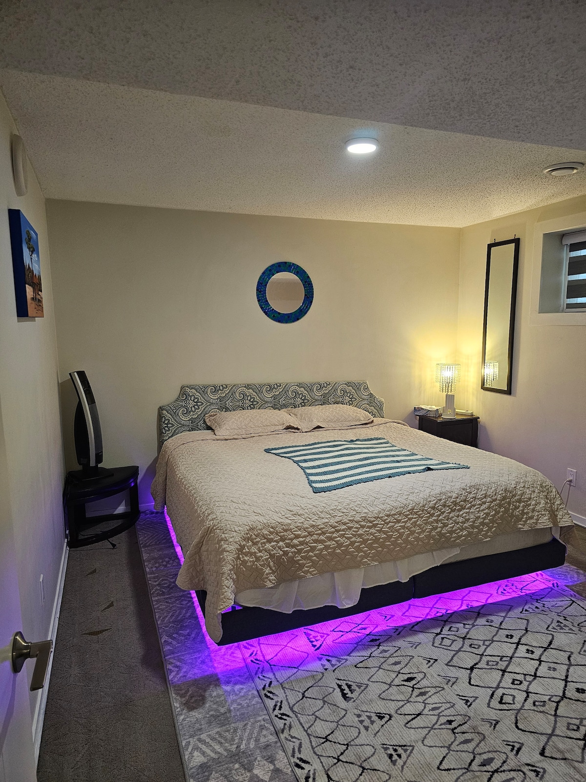 "Bright and cozy one-bedroom basement suite in Spruce Grove's desirable Spruce Ridge area. Enjoy your own private entrance and the convenience of a fully equipped kitchen. Enjoy amenities like high-speed internet, a TV with streaming services, and in-suite laundry. Perfect for a relaxing getaway." Relax in the comfortable living space and get a great night's sleep in the private bedroom. Perfect for couples or solo travelers seeking a comfortable and convenient stay."