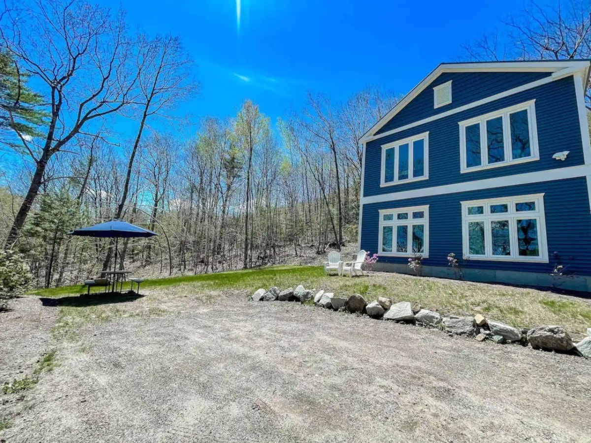 The “Baker Rocks” A-Frame is a new, well-appointed, and sits amidst a tranquil setting of river and mountain views. Nestled in New Hampshire’s Lakes and White Mountains Regions, the property is centrally located to dozens of attractions and activities. The house is fully equipped for a cozy weekend stay or a long retreat. The onsite amenities include direct river access, gym, small farm, playground, lounge area, and nearly 80 acres to explore. Firewood for sale on site for $5/bundle.