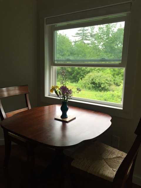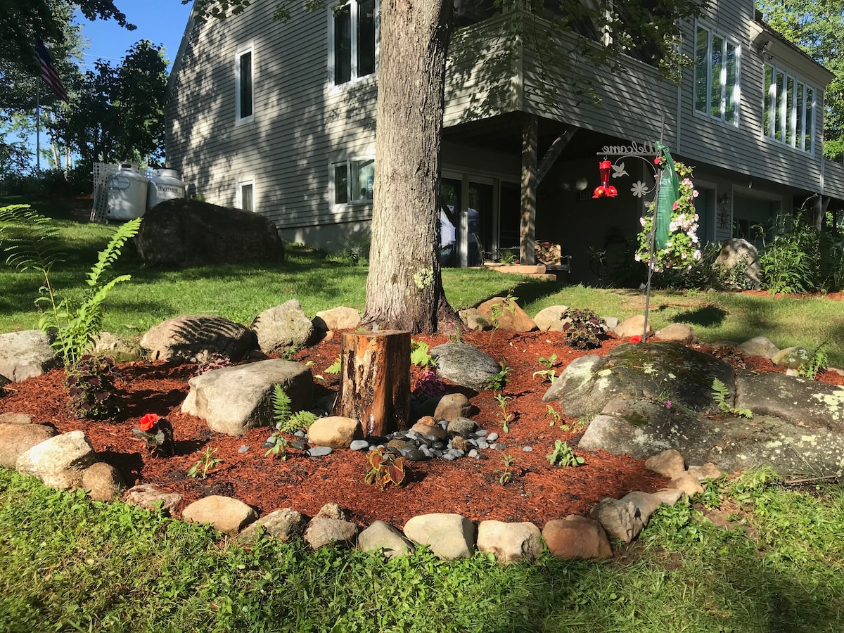 Close to town and I 93, a rural paradise. You have your own driveway and private deck with gorgeous views of hills and gardens. The bed is surrounded by two walls of windows-with shades. There is a Hearthstone gas stove, a loveseat, and a huge custom shower in a modern bathroom. The kitchen has a full size refrigerator, a kitchen counter and sink, a microwave, a blender and crock pot. There is a television with cable, Netflix, etc. We stock coffee, and breakfast foods for your convenience.