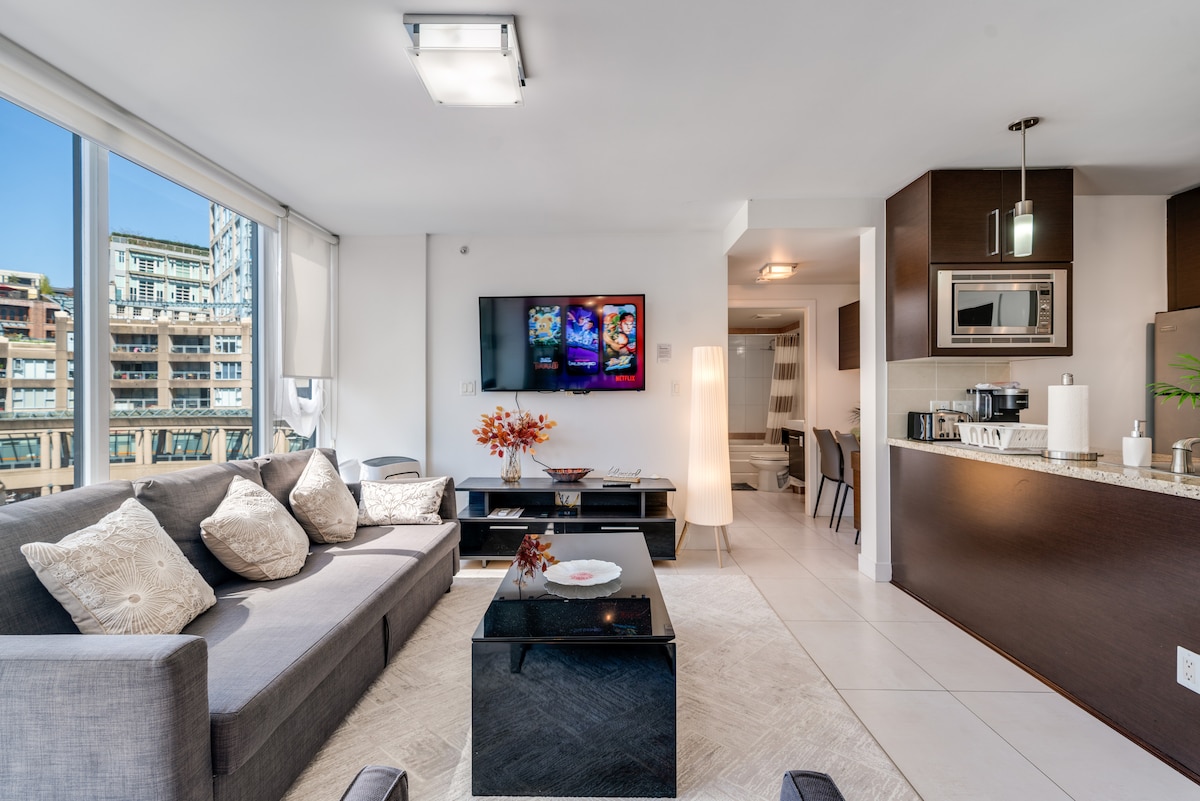 **KING SIZE BED in Marketplace Lodge **Hot tub! **FREE underground parking for 1 vehicle (with bike storage) Marketplace is full of shops and restaurants including Fresh Street Market (groceries), BC Liquor Store, Rexall Pharmacy and the Post Office. Steps to free village shuttle bus + Olympic Plaza (Free concerts in the summer + ice skating in the winter!) Note: Portable A/C only available mid June to mid Sept