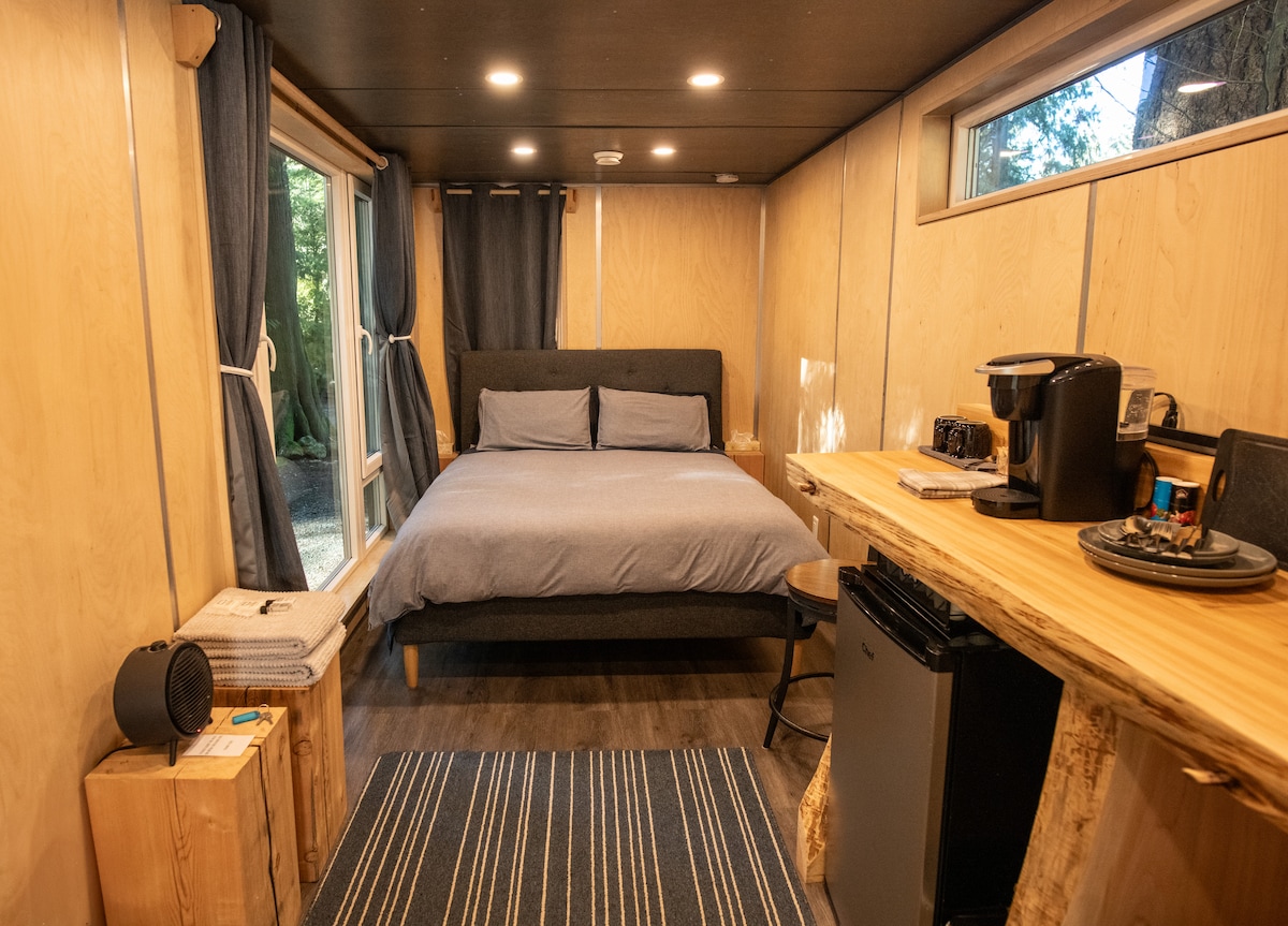 Experience unique glamping in our Seacan Bunkie, set amidst stunning natural beauty. Nestled in the woods on its own campsite, it offers a queen bed, linens, towels, a Keurig, fridge, heater, and access to clean washrooms and hot showers in a nearby building. Enjoy a private fire pit and a private sheltered BBQ area. It's perfect for outdoor activities like hiking, climbing, and biking, with Shannon Falls, the Sea to Sky Gondola, and Alice Lake all nearby.