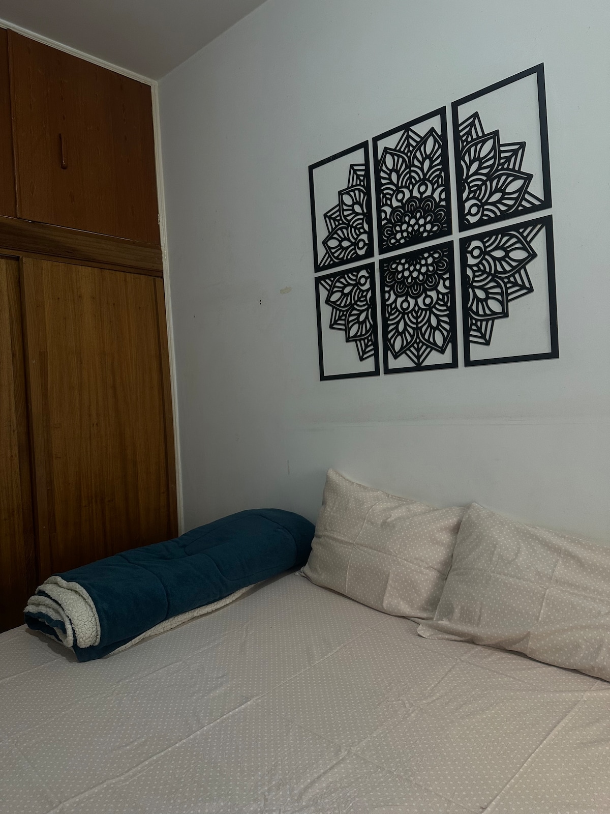 Espaço inteiro. O apartamento é amplo, aconchegante, organizado, bem arejado e iluminado, com sol da manhã. No quarto, há uma cama queen (euro colchão super premium) e um closet espaçoso. A sala é grande, com mesa de jantar, sofá-cama (casal) e uma varanda com plantas e rede. A cozinha é completa, equipada com todos os utensílios necessários. O banheiro foi reformado e possui chuveiro 220v. O ambiente conta com ar-condicionado, ventilador de teto e ventilador portátil de chão.