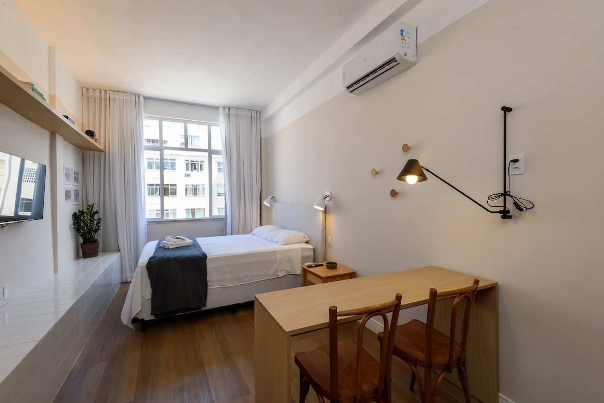 Charmoso, moderno e confortável sala e quarto com janela antirruído e ar refrigerado, de frente ao Pão de Açúcar, a Enseada e a Praia de Botafogo, a 5 minutos de Copa. Prédio com elevador, câmeras de segurança e porteiro 24h. Aconchegante, ventilado e iluminado com o sol da manhã por grandes janelas em todos os ambientes e completamente mobiliado para até 4 pessoas. Perto de shoppings, bancos, farmácias, supermercados, restaurantes e comércio em geral. Todos os transportes públicos por perto.