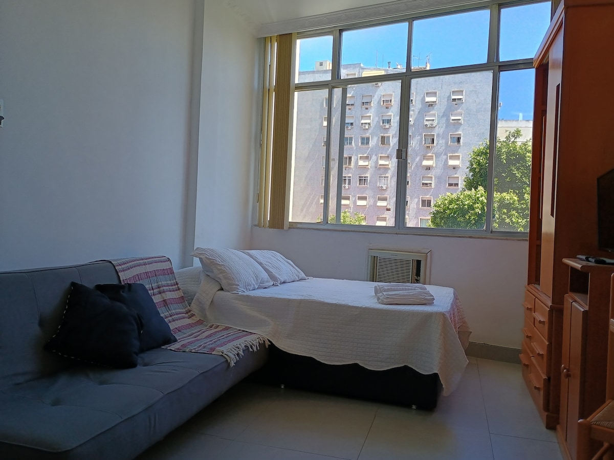 Sinta a bossa nova com a brisa do mar na CASA JOBIM, e curta toda a experiência e conforto de estar em um apartamento concept design em Copacabana, onde a inspiração se encontra com a beleza do Rio de Janeiro. Estamos localizados no Real Residence Hotel que oferece todo conforto para uma estada elegante e prazerosa. Oferecemos camareira, Wi-Fi de 500 MB, tv a cabo, Netflix e ar condicionado e espaço de coworking a três quadras da praia. Opção de duas camas de solteiro ou uma cama queen.