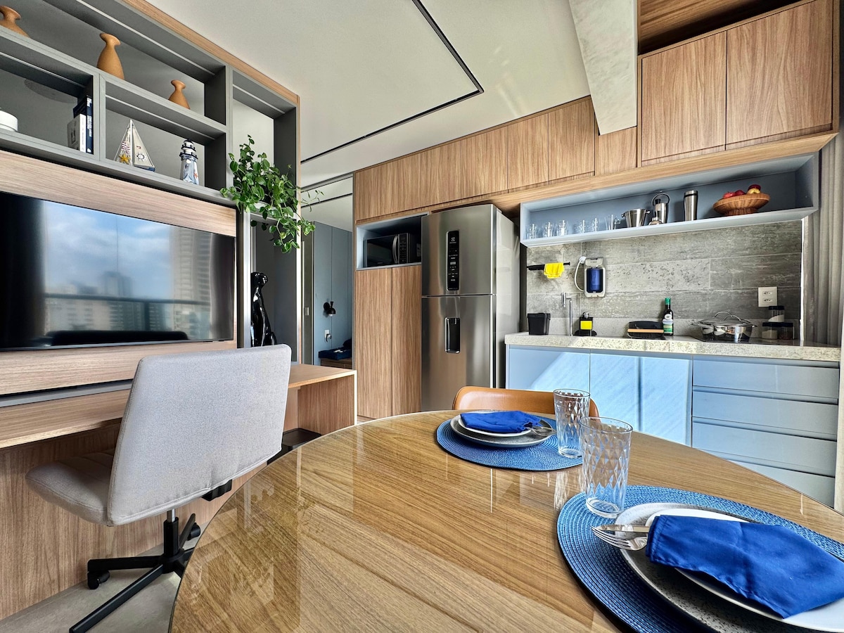 Studio moderno e aconchegante (36m²) com cama de casal, sofá-cama, smart TV, ar-condicionado, cozinha equipada, banheira e Wi-Fi rápido. Localizado no Corredor da Vitória, bairro mais nobre de Salvador, no Sol Victoria Marina (hotel 4 estrelas), com acesso ao píer privativo, com toboágua, além do restaurante Mahi Mahi, à beira-mar. Na rua tem opções de museus, mercados, cinema e academias. !Acesso ao píer gratuito apenas para hóspedes. !Apto com vista para o corredor da vitória.