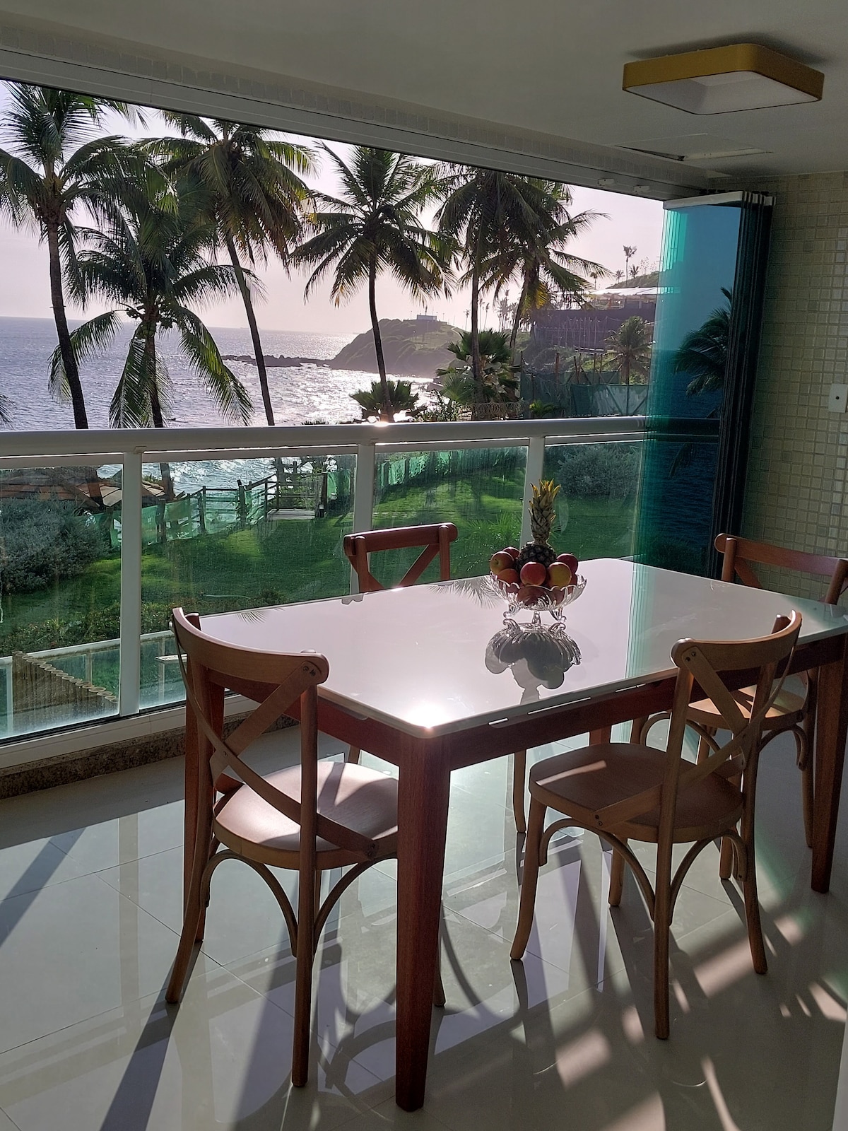 Apart decorado com vista magnífica da Baía de Todos-os-Santos, em Ondina, no circuíto do carnaval, perto do Farol da Barra e Rio Vermelho. Duas suítes com ar, sala, cozinha, Wi-Fi, serviço de camareira, recepção 24h e estacionamento rotativo na frete do Apart. Camas novas, roupa de cama e banho. Smart tv 43, geladeira, fogão, sofá-cama, micro-ondas, liquidificador, sanduicheira, cafeteiras: nespresso e arno e utencílios de cozinha. Piscinas, bar, padaria, retaurantes, lojas, galeria e salão.