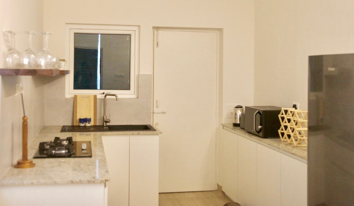 This modern, cozy and fully equipped 1 BHK apartment is located in the heart of Pondicherry. The apartment is surrounded by restaurants, grocery stores, bakeries and Boutiques. The bedroom has a king size bed with an attached bathroom, and the living room comprising of a sofa cum bed that can sleep 1 additional person. The modern kitchen is equipped with a fridge, gas stove, microwave, electric kettle, toaster, drinking water purifier washing Machine and required utensils.