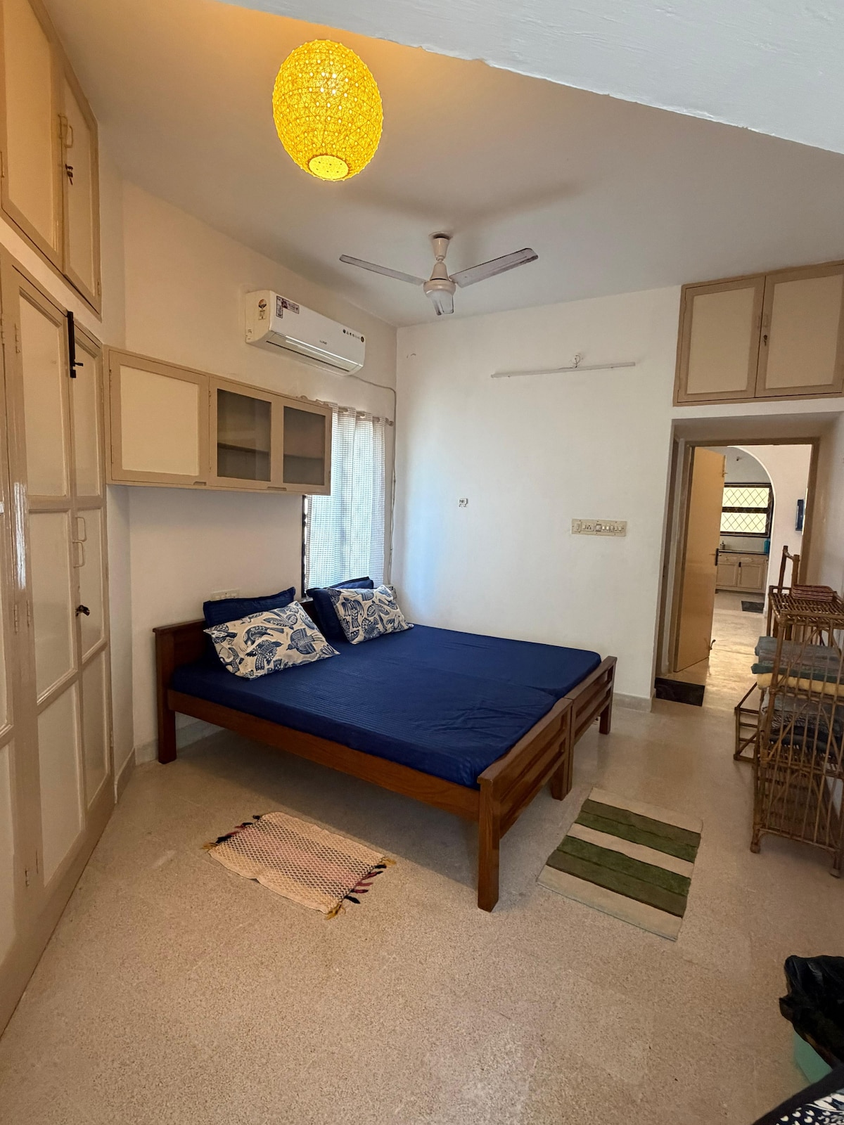 This one Bedroom Apartment at GF with a hall, functional kitchen, and attached bathroom is a fully private space with No sharing of any area. It is at walking distance from Promenade beach, Rock Beach, Ashram, White Town, market & all cafes. The Place is near White Town and still close to nature with very peaceful surroundings. All the windows are facing huge green Ground. It has fully functional kitchen with utensils, Freeze, AC, Geyser, TV, High speed wi-fi. We need id proofs of all guests.