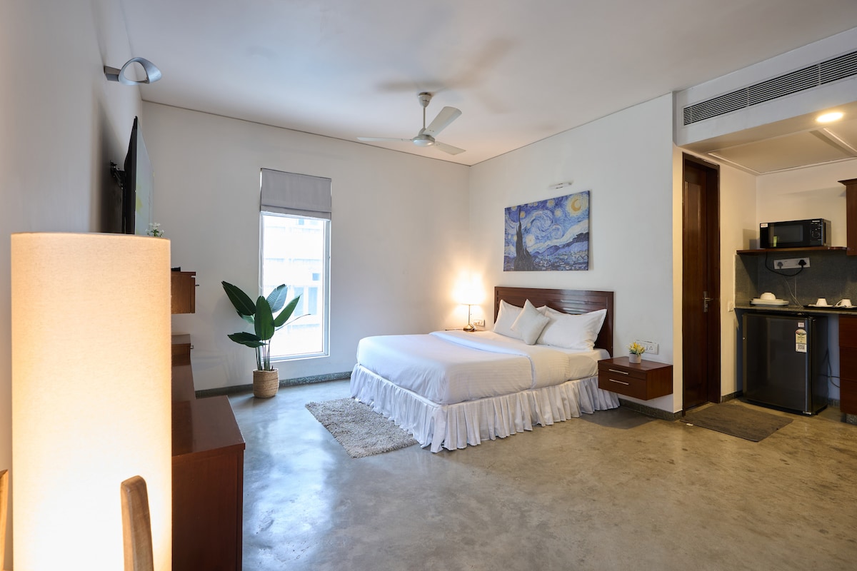 Welcome! A calm and tastefully done penthouse aesthetically setup with a private courtyard, perfect for a quiet, peaceful & relaxing stay for travelers and groups. Spend some tranquil time in your private king-sized bedroom with attached bathrooms and an additional double bed-sofa & powder room. Whip a quick meal in the self-contained kitchen or mix a drink at the bar unit. Spend time gazing at the terrace patio. Meditate, read a book in the courtyard, and enjoy a movie night in the living room.