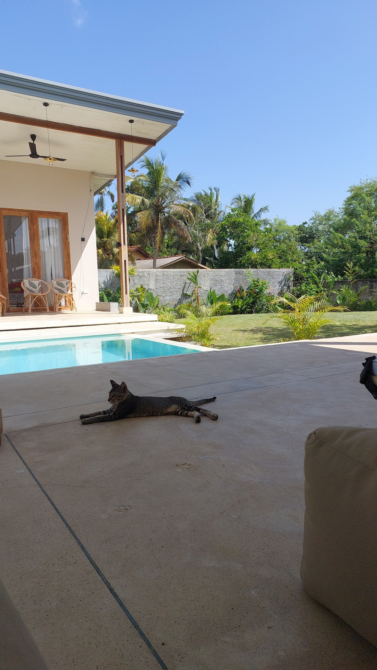 Relax with the whole family at this peaceful place to stay. Fully furnished villa with four spacious air conditioned and private balcony having bedrooms. Two bathrooms are attached, and one common with hot water. Two living areas, fully equipped open kitchen and spacious roof top. The supermarket is 200m away and public transport 75m away. To Polhena beach 600m, Madiha surfing spot 1km, Waligama tourism town 8km, Mirissa tourism area 5km.